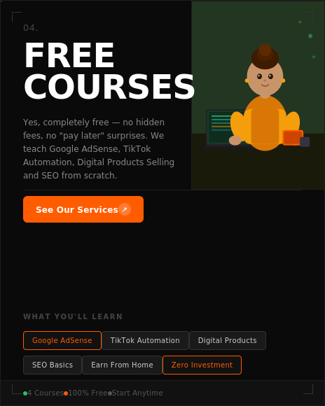 Yes, completely free — no hidden fees, no "pay later" surprises. We teach Google AdSense, TikTok Automation, Digital Products Selling and SEO from scratch. Real skills, real results, zero investment. Just show up and learn.